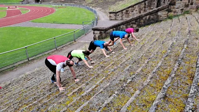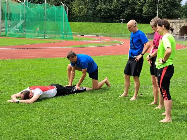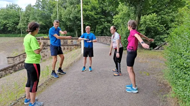 Das Training begann mit einem 10-minütigen Aufwärmprogramm, Dehnübungen für Läuferinnen und Läufer, Treppenlauf, Treppensteigen, Handlauf für Außentreppen (Training im Freien), Barfusslaufen und Partnermassage. Es wurde ein Gruppenfoto gemacht.