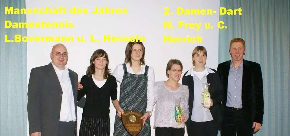 Laura Hesseln und Laura Bovermann als Mannschaft des Jahres im Tennissport. Zweite im Mannschaftsport Dart wurden Nadine Frey und Carina Herrich. Als Drittplazierten kamen die Dart Herren Mischa Brock und Rainer Hüwe.